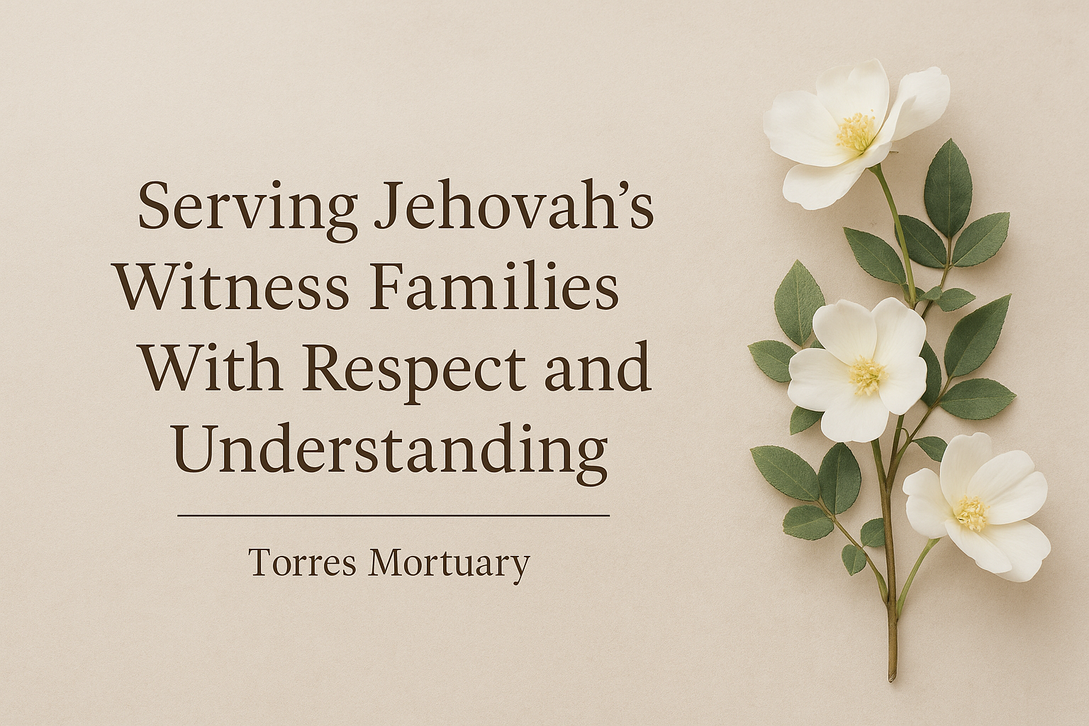 Serving Jehovah’s Witness Families With Respect and Understanding At Torres Mortuary , we honor the beliefs and traditions of every family we serve. For Jehovah’s Witness families , funeral services are a meaningful opportunity to show love, comfort, and dignity while keeping the focus on faith, scripture, and the hope of resurrection. We understand the unique preferences of Jehovah’s Witnesses and are committed to providing services that reflect their values with respect and care. Understanding the Beliefs That Shape Their Funeral Practices Jehovah’s Witnesses approach funerals with simplicity, humility, and hope. Their services are typically: Simple and respectful Focused on scripture and Bible-based comfort Centered on the hope of resurrection Conducted without religious symbols such as crosses or images Led by an elder or qualified congregation member Knowing these preferences allows our staff to support families in a way that aligns with their beliefs and ensures their loved one is honored properly. What a Typical Jehovah’s Witness Funeral Includes While each family has their own personal wishes, services generally include: A Bible-based talk delivered by an elder Scriptural readings that highlight comfort and the hope of future life Simple prayers , if the family chooses Printed programs featuring scriptures, comforting words, and a photo of their loved one A modest, peaceful environment without religious icons We ensure the setting respects these expectations and reflects the dignity and meaning that families desire. Printed Materials for Jehovah’s Witness Families At Torres Mortuary, we offer customized memorial materials that align with Jehovah’s Witness preferences, including: Printed memorial programs with scriptures such as John 5:28, 29 or Psalm 34:18 Guest register books without religious imagery Photo-based prayer cards or memorial cards without crosses or traditional religious artwork Neutral designs using floral, nature, landscape, or soft textured backgrounds These materials are crafted to provide comfort while respecting the beliefs of the family and congregation. How Torres Mortuary Supports Jehovah’s Witness Families We take great care to support families in a manner consistent with their practices: Coordinating with the presiding elder for scheduling and service details Providing a simple, respectful chapel setting Ensuring no religious symbols are displayed unless requested Assisting with burial or cremation arrangements based on the family’s wishes Offering custom print materials designed to reflect their beliefs Maintaining modest, peaceful surroundings for viewing or gathering Every detail is handled with the utmost respect for their faith and traditions. Our Promise Jehovah’s Witness families place great value on modesty, dignity, and scriptural comfort. At Torres Mortuary , we are honored to serve them with that same spirit of care. Our goal is to create a service that brings peace, honors their loved one, and reflects their beliefs with sincerity and compassion. Whether your family needs guidance, printed materials, or support in planning the service, we are here to walk with you every step of the way.